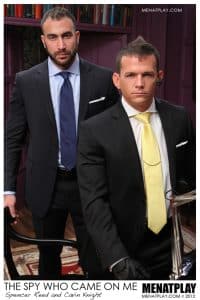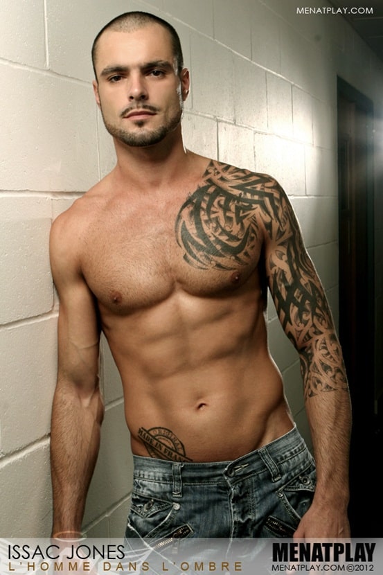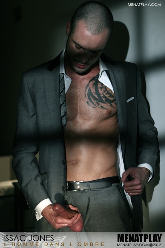 Men at Play says: With his deep dark eyes, and sensual French accent Issac Jones is one of our most enigmatic and mysterious men. But never more so than in this week’s movie update where we see Issac impeccably dressed in a grey suit and black leather gloves waiting for us between the dark shadows, cigarette in one hand, hard bulge in the other.