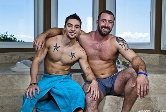 Next Door Buddies says: Vinny Castillo and Johnny Torque are surprised in this impromptu scene in the bathroom. Vinny, having never been with a man before, seems to be a natural as Johnny exits the shower and begins to blow him.